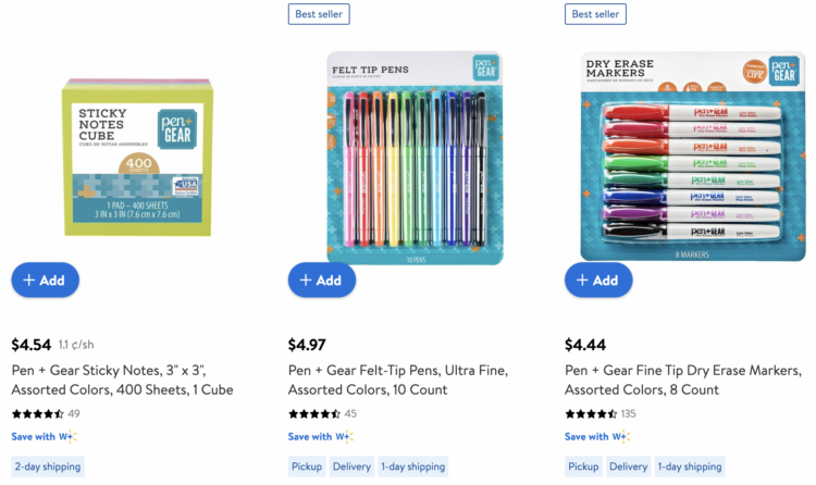 Walmart’s private label brand for school and office supplies, Pen + Gear currently lists over 500 items on Walmart.com. The brand sells goods such as notebooks, organizers, bubble wrap, writing instruments, paper products, magnets, and novelty items.